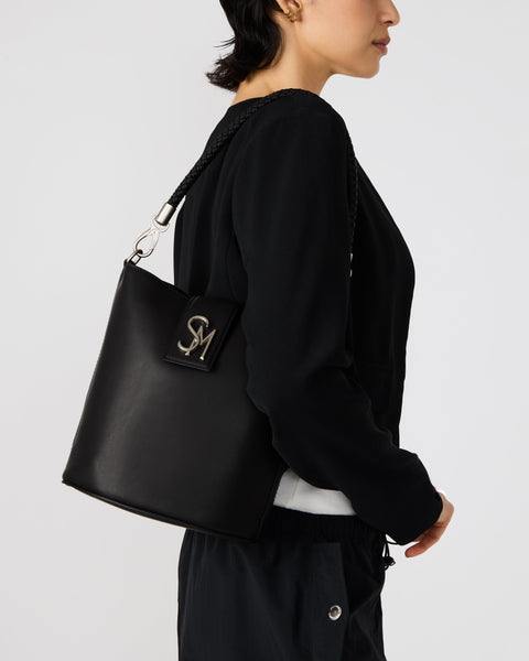 תיק באקט לנשים עם רצועת נשיאה לצד הגוף בשחור בשילוב אלמנטים כסופים מבית סטיב מאדן