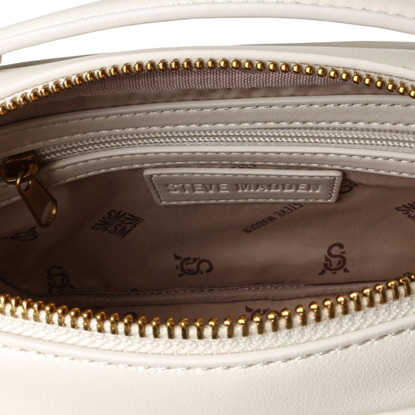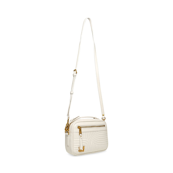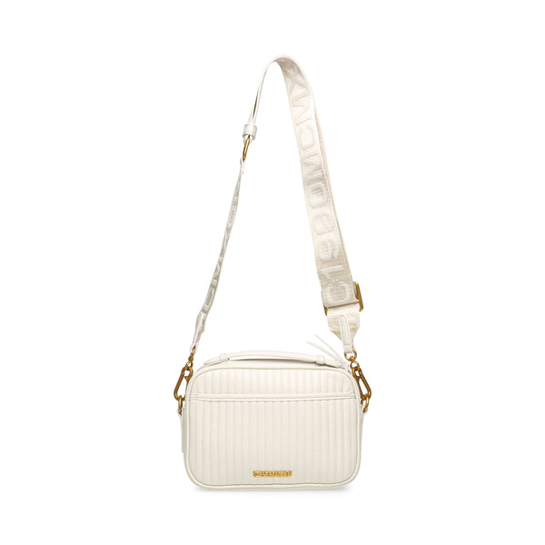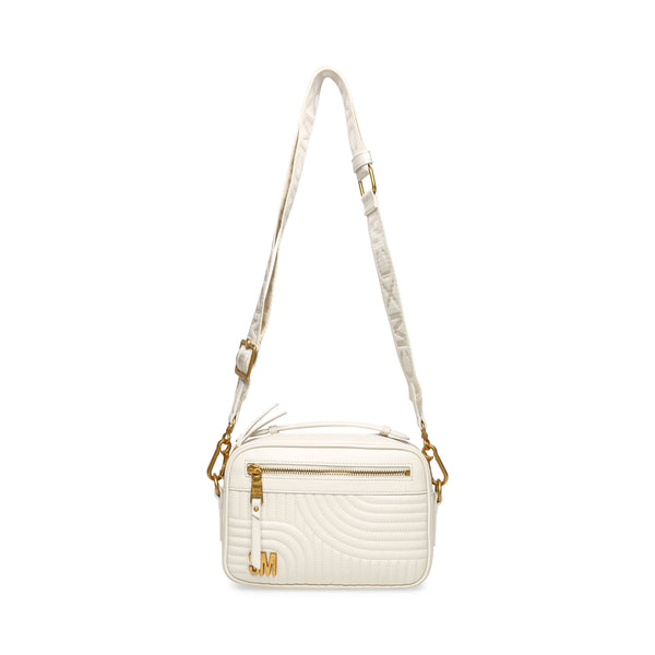 תיק צד לנשים בקרם עם לוגו זהוב ורצועה ממותגת מבית מבית סטיב מאדן