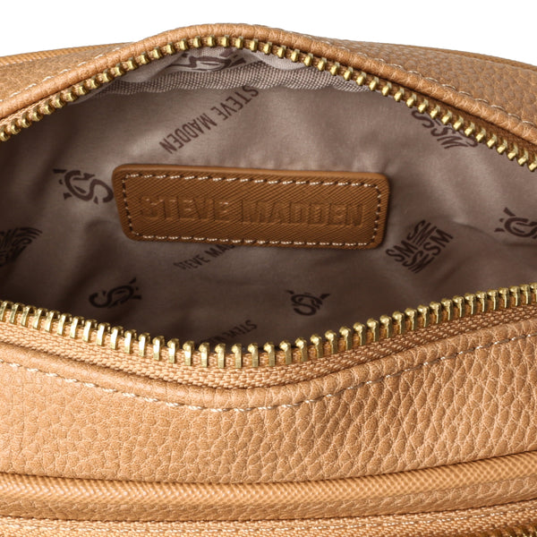 תיק צד לנשים בקאמל עם לוגו מוזהב ורצועה ממותגת מבית סטיב מאדן