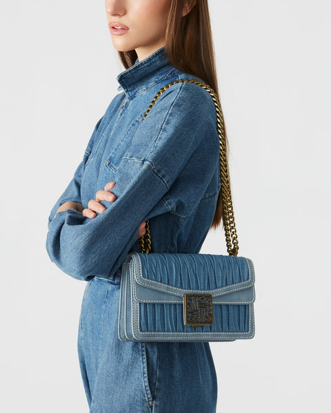 תיק צד לנשים בג׳ינס עם רצועת שרשרת ולגו מתכתי מבית סטיב מאדן