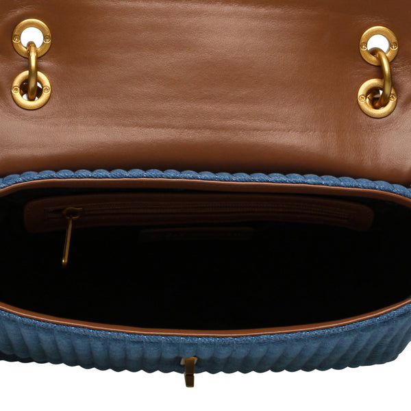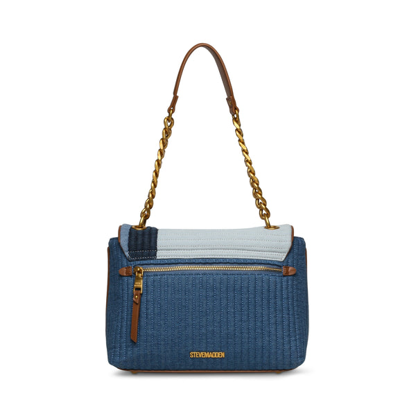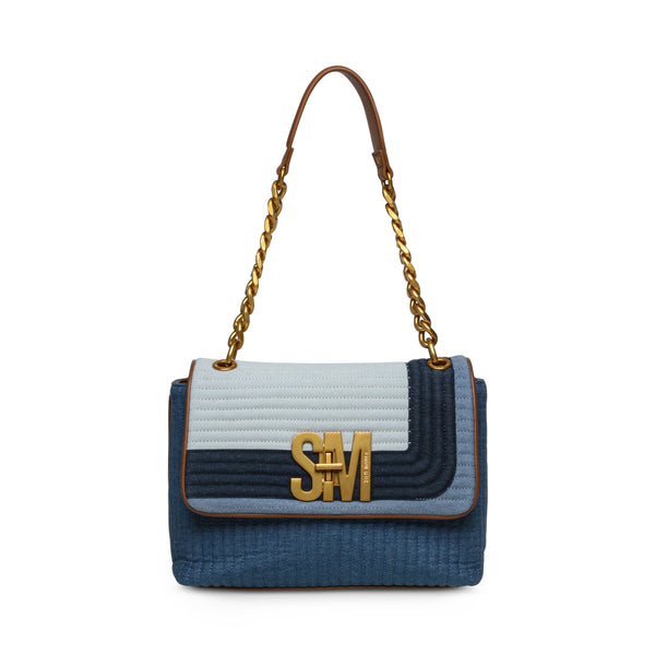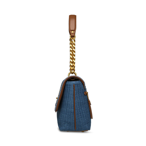 תיק צד לנשים בג׳ינס עם לוגו זהוב ורצועות שרשרת מבית סטיב מאדן