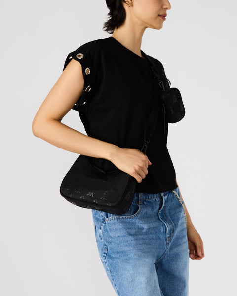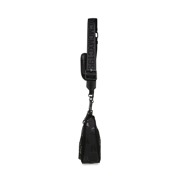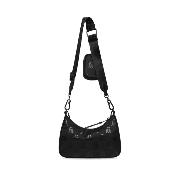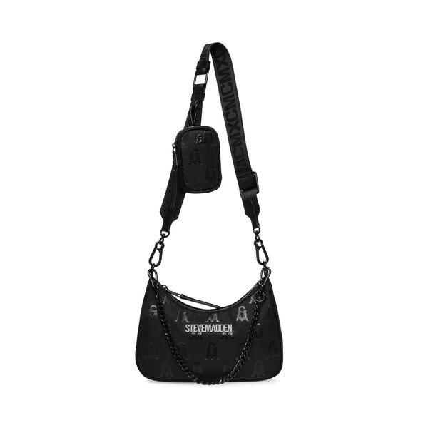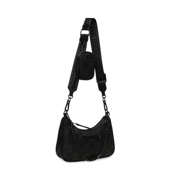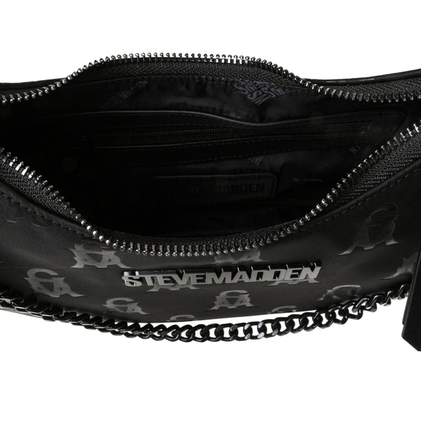 תיק צד לנשים בשחור עם הדפס לוגו ורצועת נשיאה ממותגת עם נרתיק חיצוני מבית סטיב מאדן