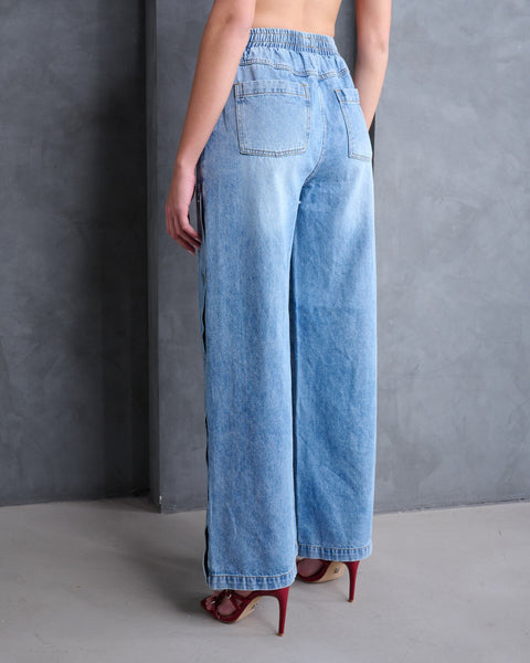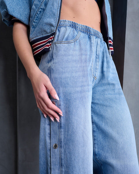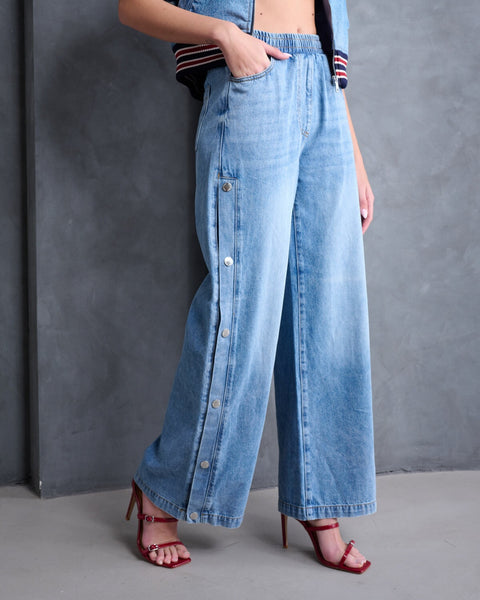 מכנסי ג׳ינס ארוכים לנשים פתוחים בצדדים עם כפתורי טיק טק ורצועת גומי במותן מבית סטיב מאדן