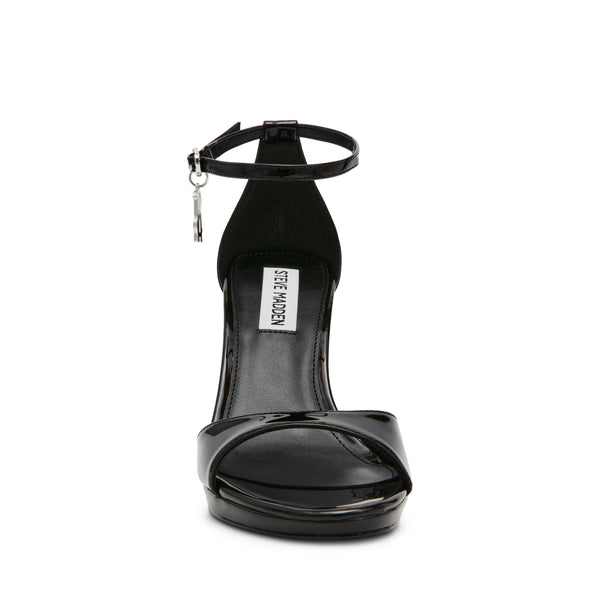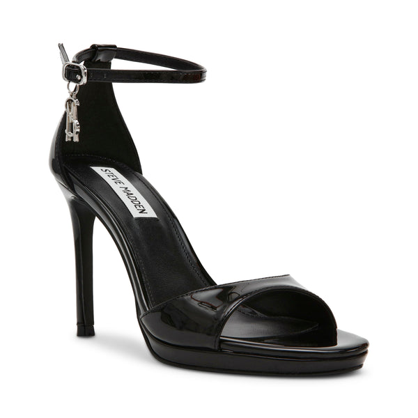 סנדלי עקב לנשים בשחור בגימור מבריק עם תליון כסוף ברצועת קרסול מבית סטיב מאדן