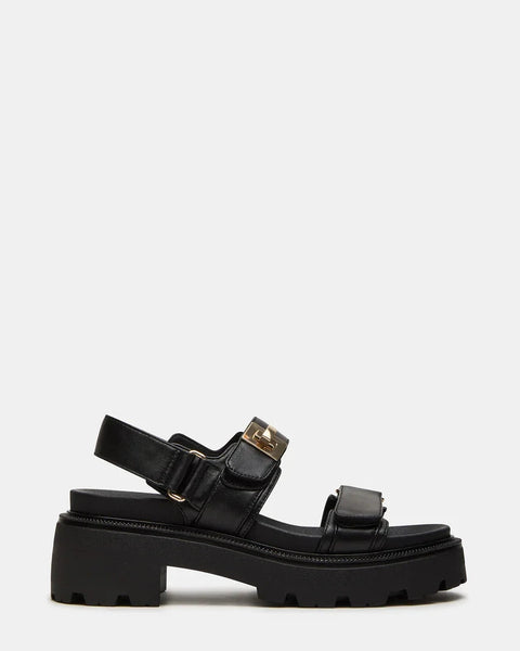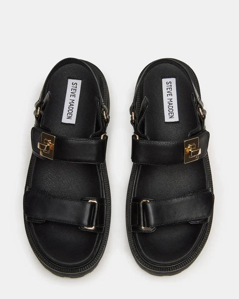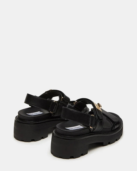 סנדלי פלטפורמה מעור בשחור עם סוליה צ'אנקית ואלמנטים מוזהבים מבית סטיב מאדן