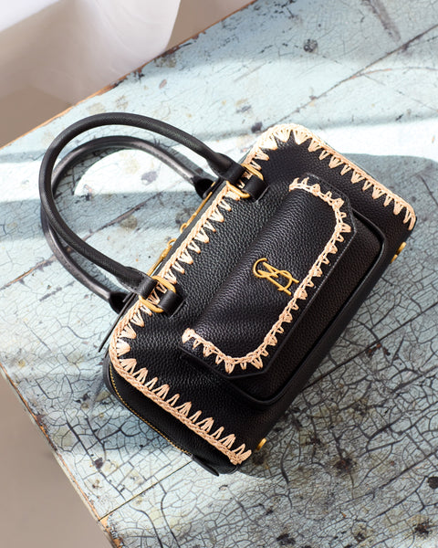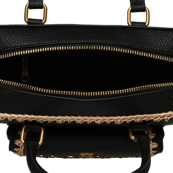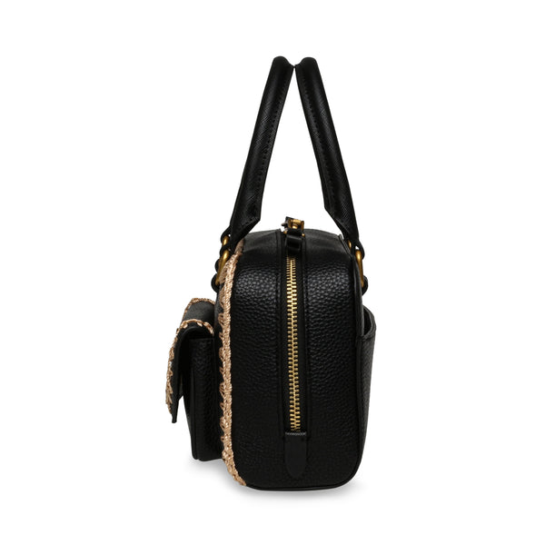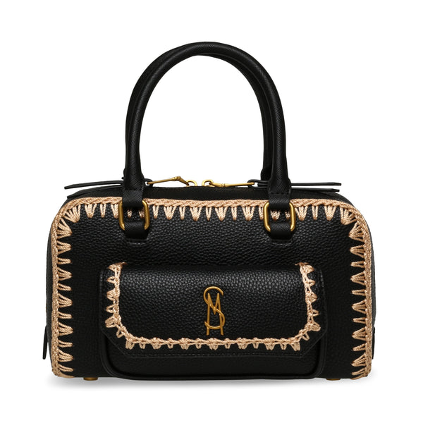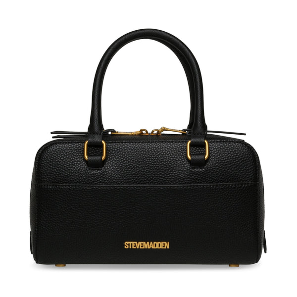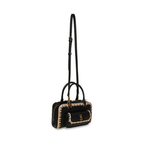 תיק יד לנשים בשחור משולב עם לוגו ותיפורים מוזהבים וכיס חיצוני, לתיק רצועת נשיאה הניתנת להסרה מבית סטיב מאדן