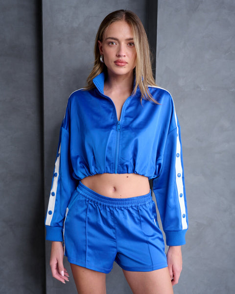 ג׳קט לנשים בכחול בגזרת קרופ עם כפתורי טיק טק בשרוולים וסיומת גומי מבית סטיב מאדן