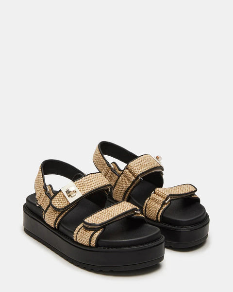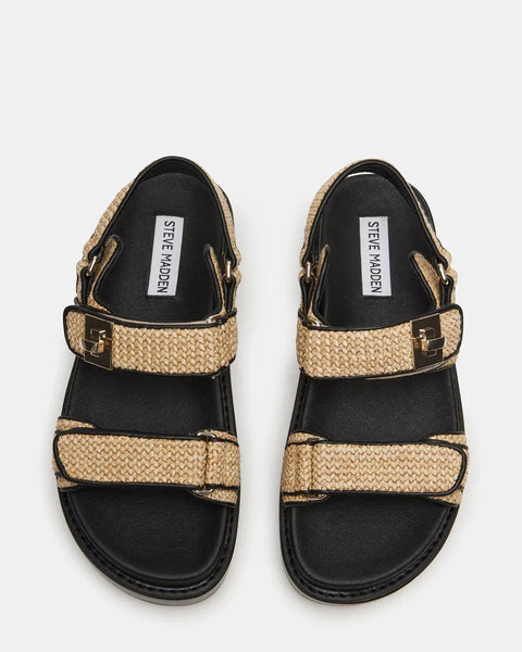 סנדלים לנשים עם רצועות בסגנון קלוע בשחור משולב בז' ואלמנטים מוזהבים מבית סטיב מאדן