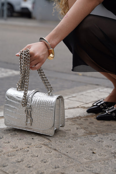 תיק צד לנשים בכסוף בסגנון מנוחש עם לוגו ורצועת שרשרת כסופים מבית סטיב מאדן