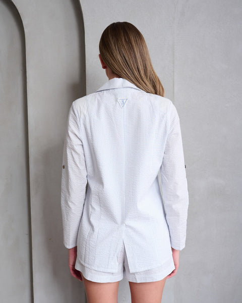 בלייזר לנשים בלבן משולב פסים בגוון כחול עם לוגו רקום מבית סטיב מאדן