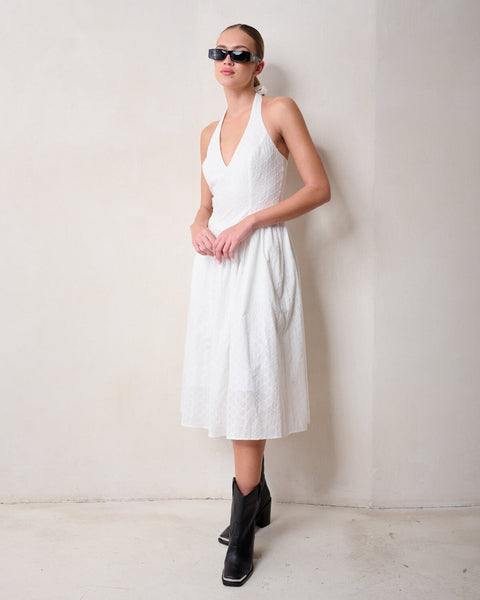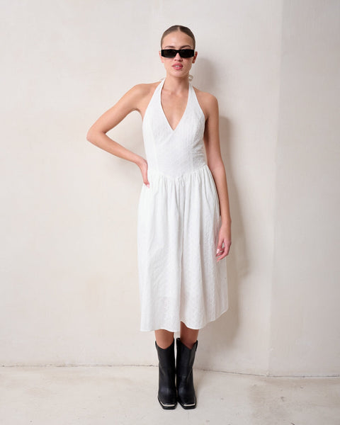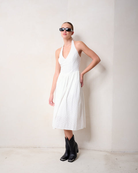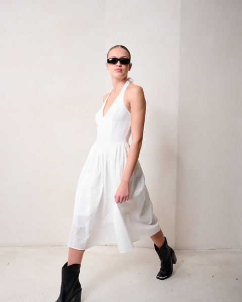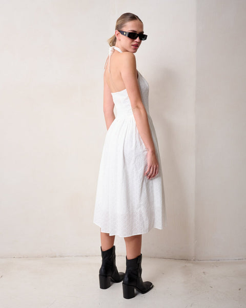 שמלת מידי לנשים בלבן עם מחשוף V וקשירה אחורית מבית סטיב