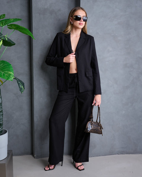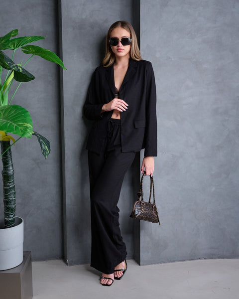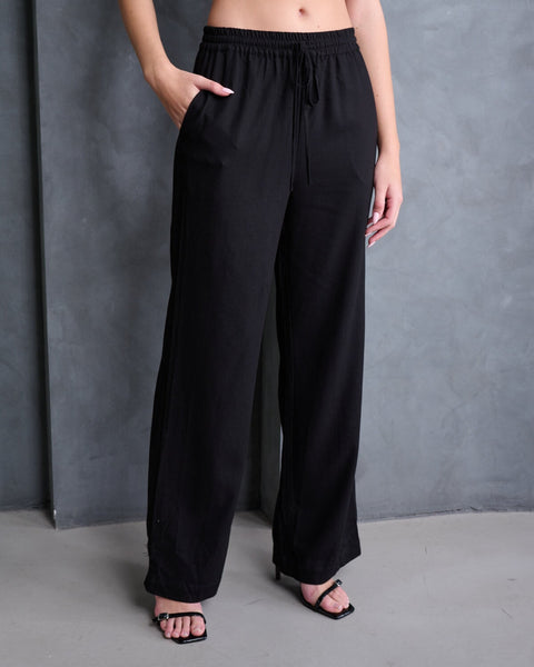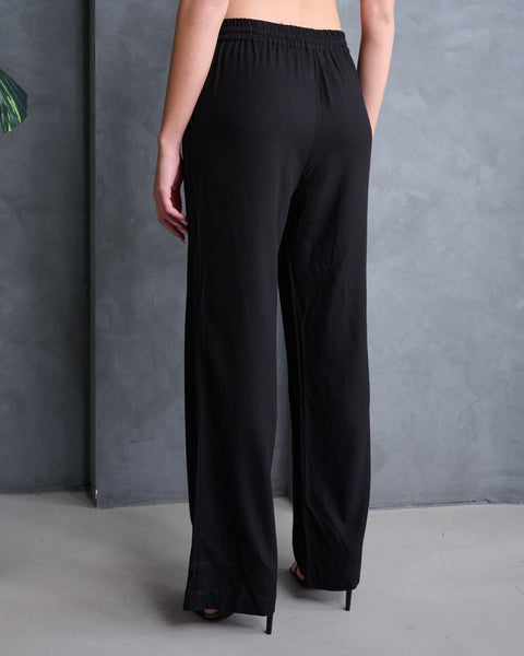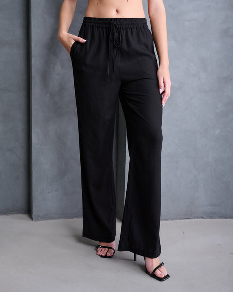 מכנסיים ארוכים לנשים בשחור בגזרה ישרה עם גומי קשירה במותן מבית סטיב